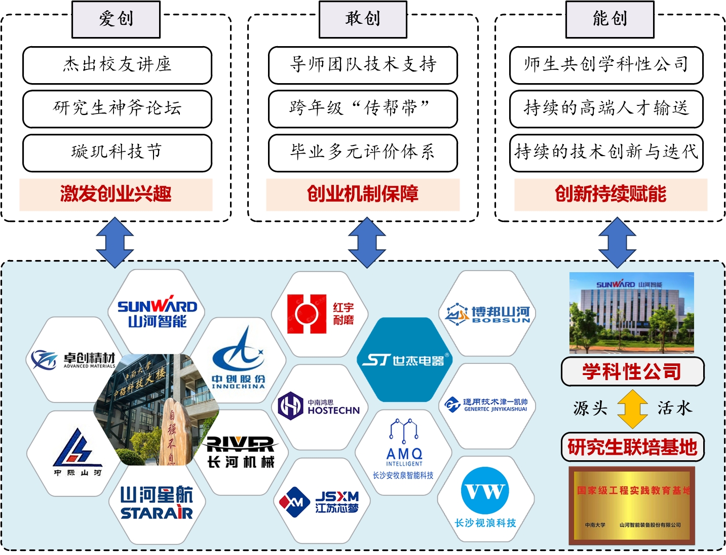 创新提出“师生共创学科性公司”成果转化路径,构建“科研—转化—反哺”价值闭环。公司累计孵化山河智能、中南鸿思、中创空天等学科性公司20余家,其中多家已成为上市公司或国家级专精特新“小巨人”企业。研究生在导师指导下,不仅完成技术突破,更深度参与创业实践,真正实现“创新落地、人才成长、产业反哺”的良性循环。